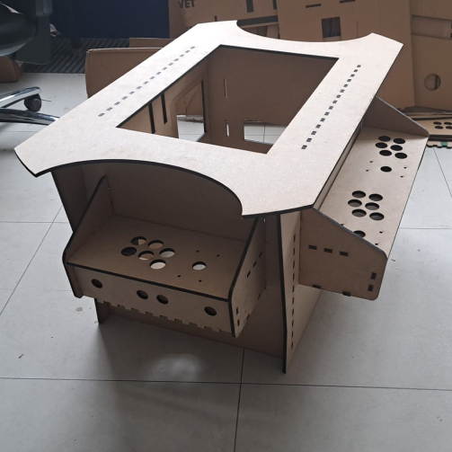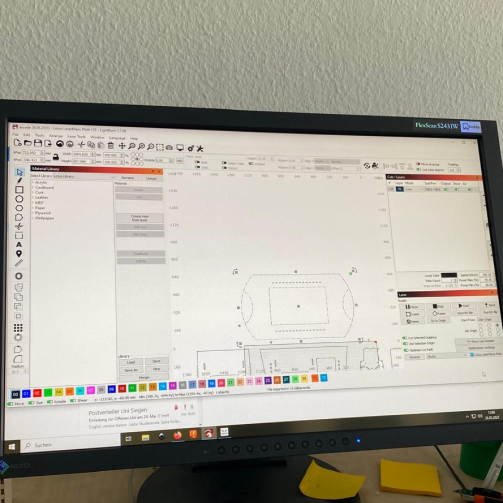 Unsere Arbeit begann mit der Planung des Automatengehäuses in Adobe Illustrator. Als Grundlage diente uns eine bereits bestehende Vektordatei, die wir an mehreren Stellen anpassen mussten – unter anderem in Bezug auf Maße und Bauteilformen. Da der Einstieg ins Programm nicht ganz einfach war, arbeiteten wir oft im Team zusammen, um die Datei Stück für Stück zu optimieren. Im Laufe des Projekts wurde sie mehrfach überarbeitet, bis sie für den Laserschnitt bereit war.